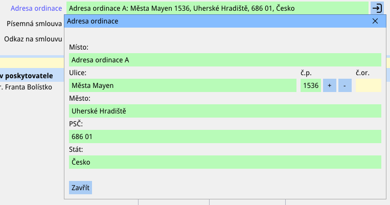 • „Adresa ordinace A: Města Mayen 1536, Uherské Hradiště, 686 01, Česko“ nebo s vynecháním některých údajů: