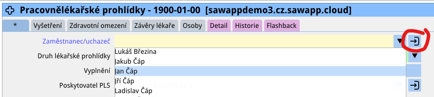 Funkce se použije kliknutím na ikonku „přenesení záznamu – vstup“ (ikonka dveří s šipkou doprava), vedle rozevíracího seznamu, viz obrázek: