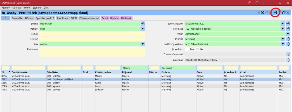 Zde stačí dohledat správného zaměstnance, který má být na pracovnělékařskou prohlídku odeslán. Vyhledání usnadní filtry a třídění záznamů. Jakmile je zaměstnanec (záznam) dohledán, stačí řádek s tímto záznamem označit levým tlačítkem myši a následně kliknout na ikonku „přenesení záznamu – zpět“ (dveře s šipkou doleva v hlavním záhlaví agendy), viz obrázek:
